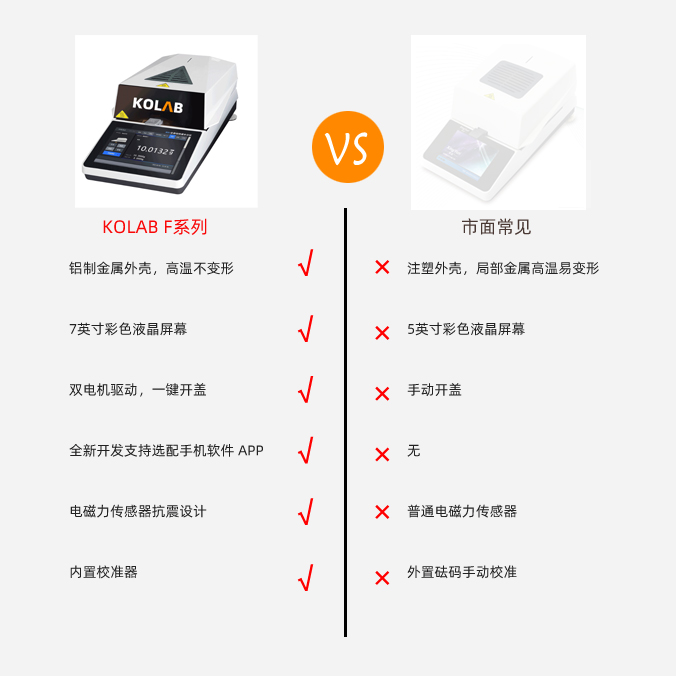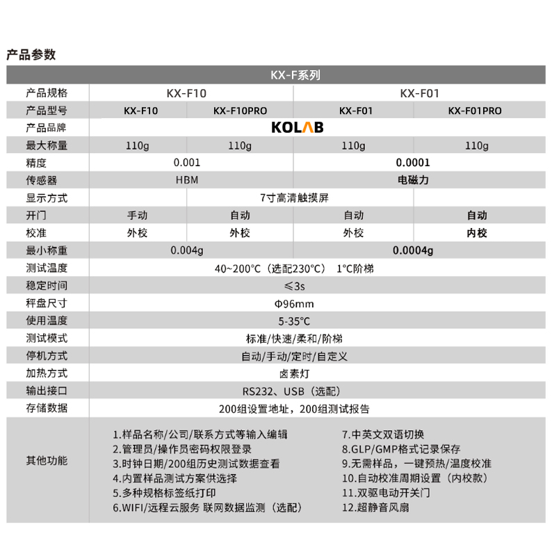 KX-F系列智能水分測定儀集成了KOLAB 科西水分測定成熟技術,使整個分析系統更加**善。采用高效率的烘干加熱器-高品質環狀鹵素燈進行加熱,對樣品進行快速、均勻的加熱;儀器設計智能化、簡單化,實現了用戶*鍵式測量功能,*需**業知識。因*同行業對水分有著*同的定義,為滿足用戶的需求,KX-F系列內置多種水分顯示方式,包括但*限于含水率、固含量、回潮率、木材含水率等多種模式,并針對*同行業的*同樣品,儀器預留了多種用戶自定義測定方法,用戶可根據實際需求設置測量模式,自定義程序自動儲存,調取方便、快速,滿足行業多種樣品的測定需求。該系列水分測定儀全金屬機身、支持高溫檢測,升溫快、加熱均勻、使用簡單、壽命長等特點。